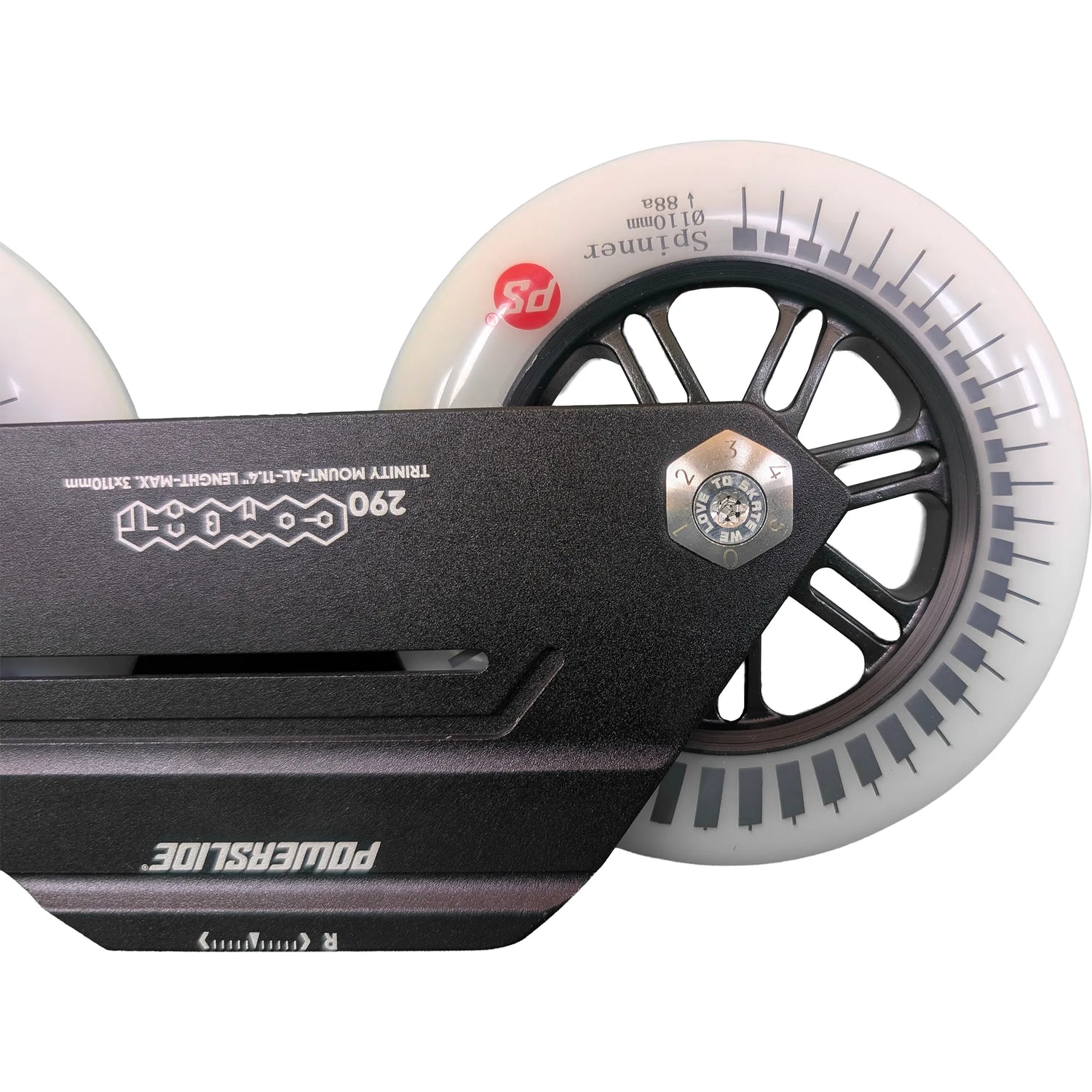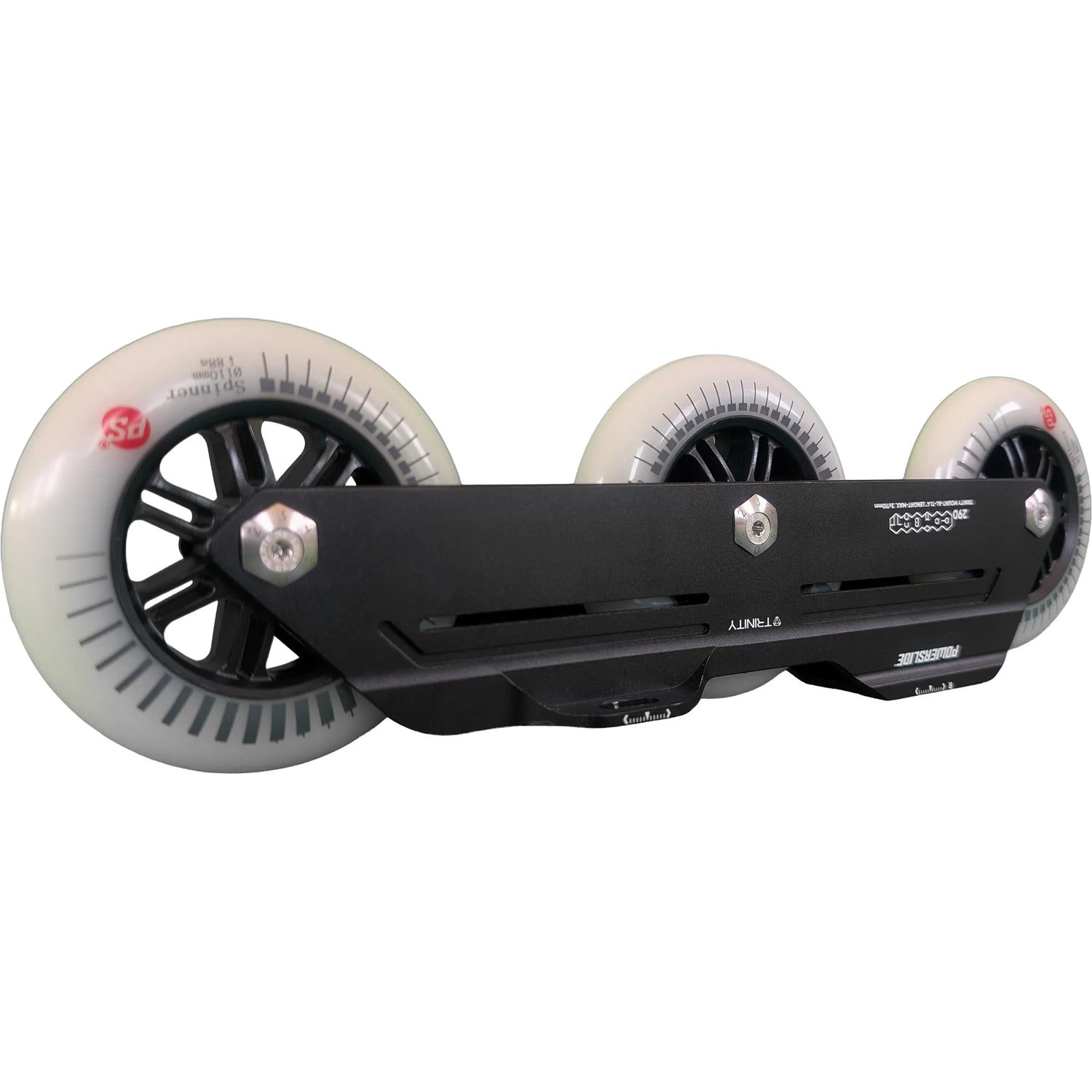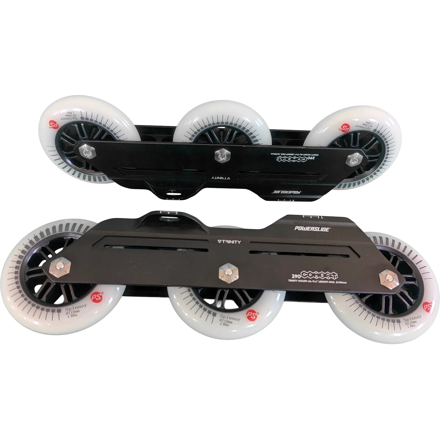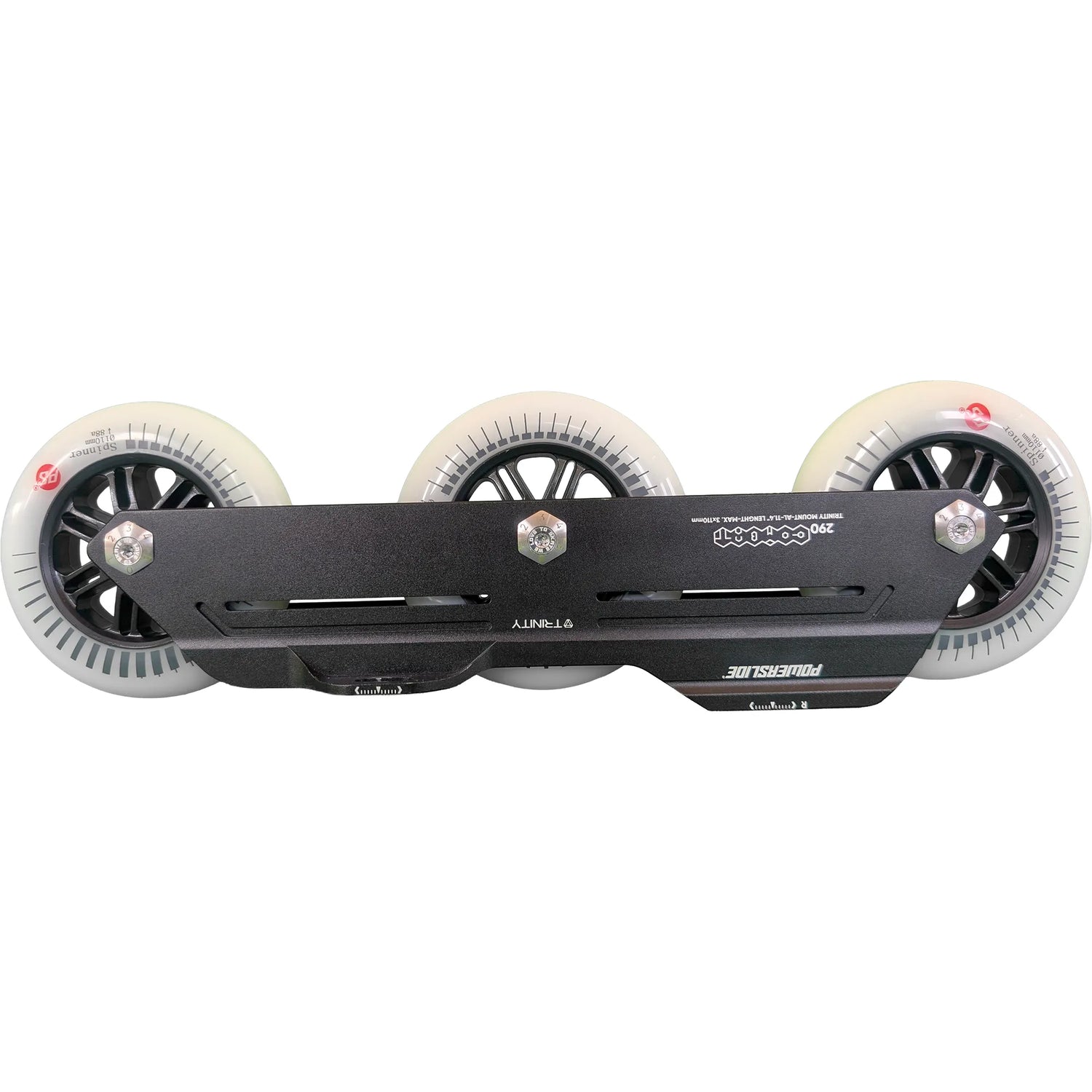 Begrüße die POWERSLIDE Trinity Combat Rocker Frames 3x 110mm im Komplettpaket mit 3x 110mm Powerslide Spinner Rollen mit einer Härte von 88A und Wicked ABEC 9 Kugellagern.