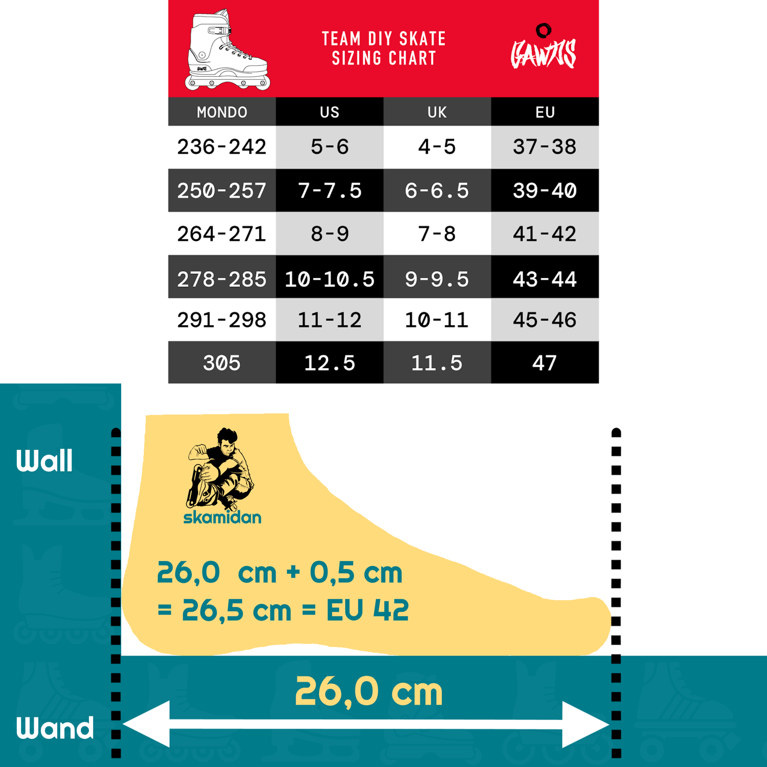 If your foot measures 26.0cm, with a tolerance of 5mm this results in a length of 26.5cm.
