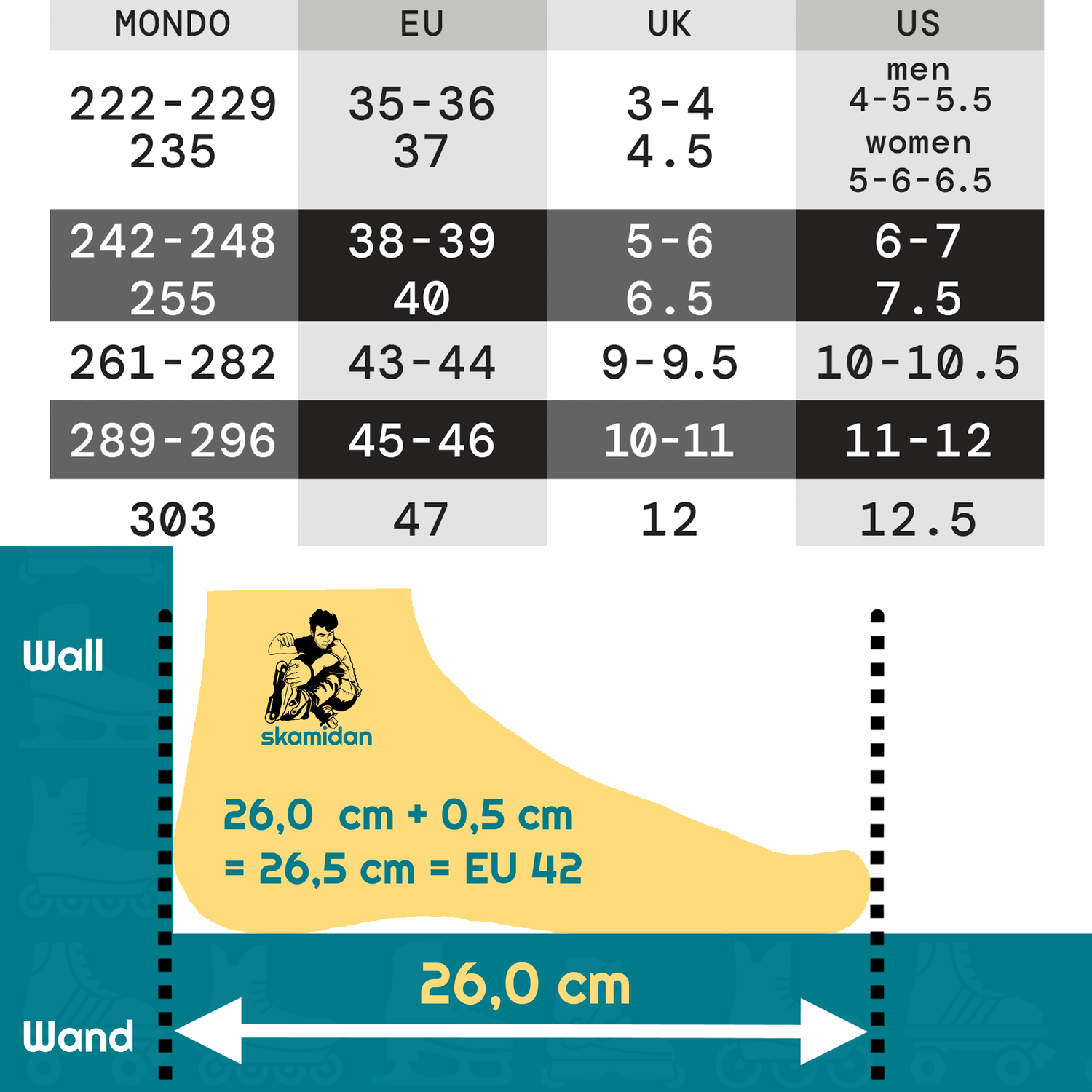 If your foot measures 26.0cm, with a tolerance of 5mm this results in a length of 26.5cm.