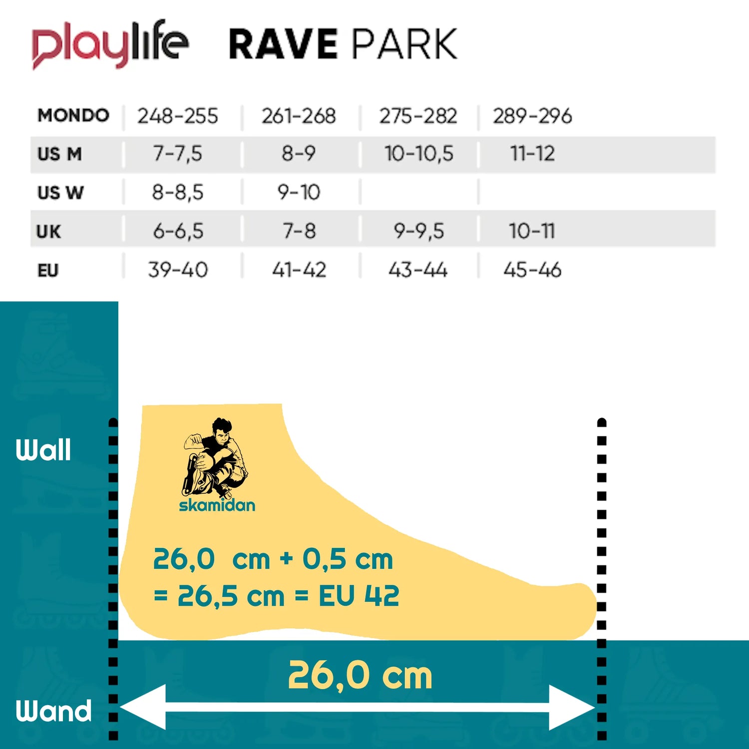 If your foot measures 26.0cm, with a tolerance of 5mm this results in a length of 26.5cm.